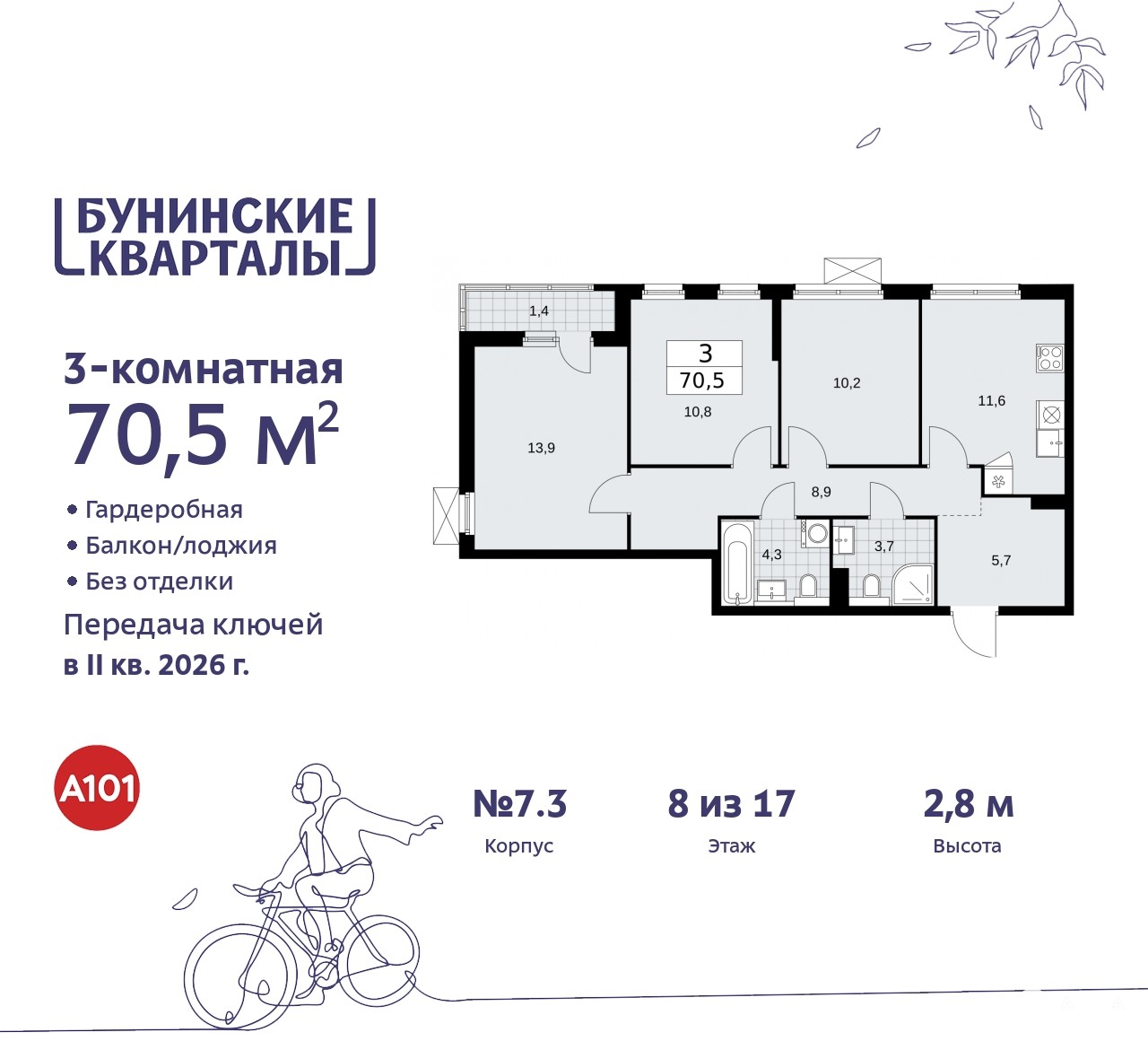 Трехкомнатная квартира от застройщика в ЖК "Бунинские кварталы" на 8 этаже. Квартира без отделки, новый владелец может сделать ремонт по индивидуальному проекту. Общая площадь: 70.5 кв.м., жилая: 34.9 кв.м., площадь просторной кухни-столовой: 11.6 кв.м. Квартира угловая, очень светлая, естественная вентиляция при открытии окон. В квартире одна лоджия, два совмещенных санузла. Высота потолков 2.8 м.