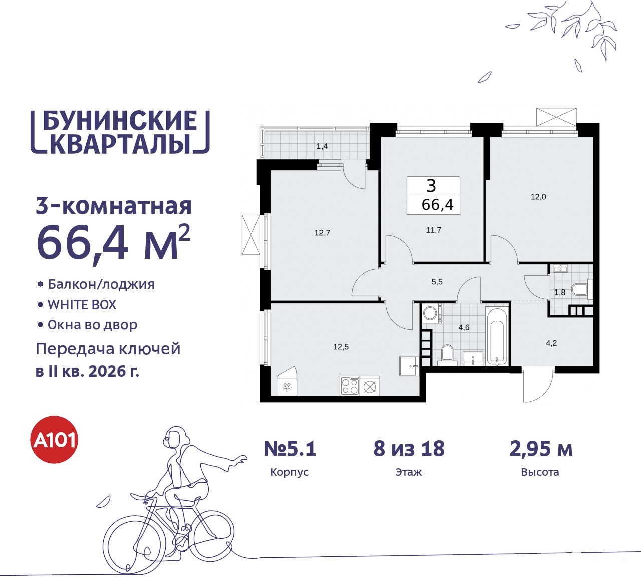 3-комн. квартира с отделкой в ЖК "Бунинские кварталы" на 8 этаже. Общая площадь: 66.4 кв.м., жилая: 36.4 кв.м., площадь просторной кухни-столовой: 12.5 кв.м. Квартира угловая, очень светлая, естественная вентиляция при открытии окон. В квартире одна лоджия, один совмещенный и один раздельный санузел. Высота потолков 2.95 м.