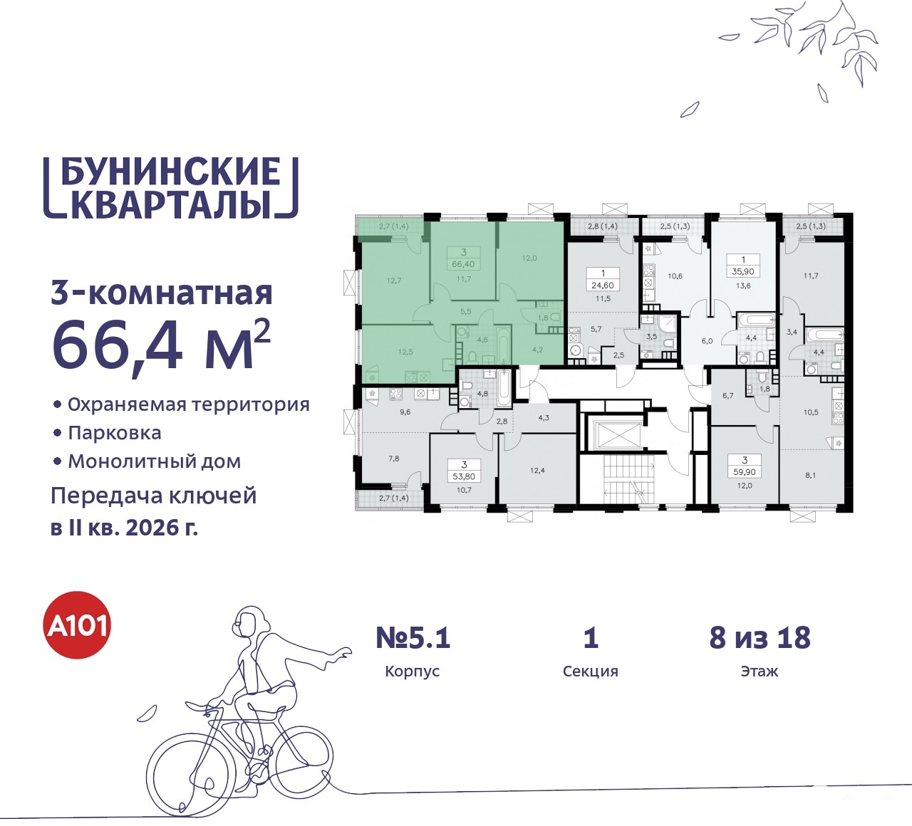 Дом монолитный, многоподъездный, переменной этажности, от 9 до 18 этажей. Квартира находится в 1-й секции высотой 9 этажей в корпусе 5.1. На этаже 5 квартир. В подъезде 1 грузовой лифт. Начало строительства - 4 квартал 2023 года. Окончание строительства - 2 квартал 2026 года. Оформление сделки по договору долевого участия.