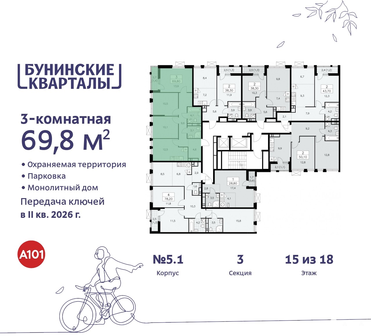 Дом монолитный, многоподъездный, переменной этажности, от 9 до 18 этажей. Квартира находится в 3-й секции высотой 18 этажей в корпусе 5.1. На этаже 7 квартир. В подъезде 1 пассажирский и 1 грузовой лифт. Начало строительства - 4 квартал 2023 года. Окончание строительства - 2 квартал 2026 года. Оформление сделки по договору долевого участия.