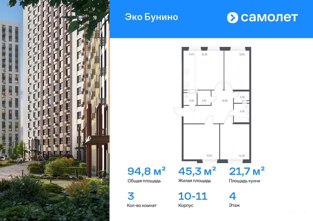 Строим кварталы для жизни с заботой о будущем. Предлагается 3-комнатная квартира комфорт-класса 94, 8 кв.м в корпусе 10-11 на 4 этаже, в ЖК «Эко Бунино»