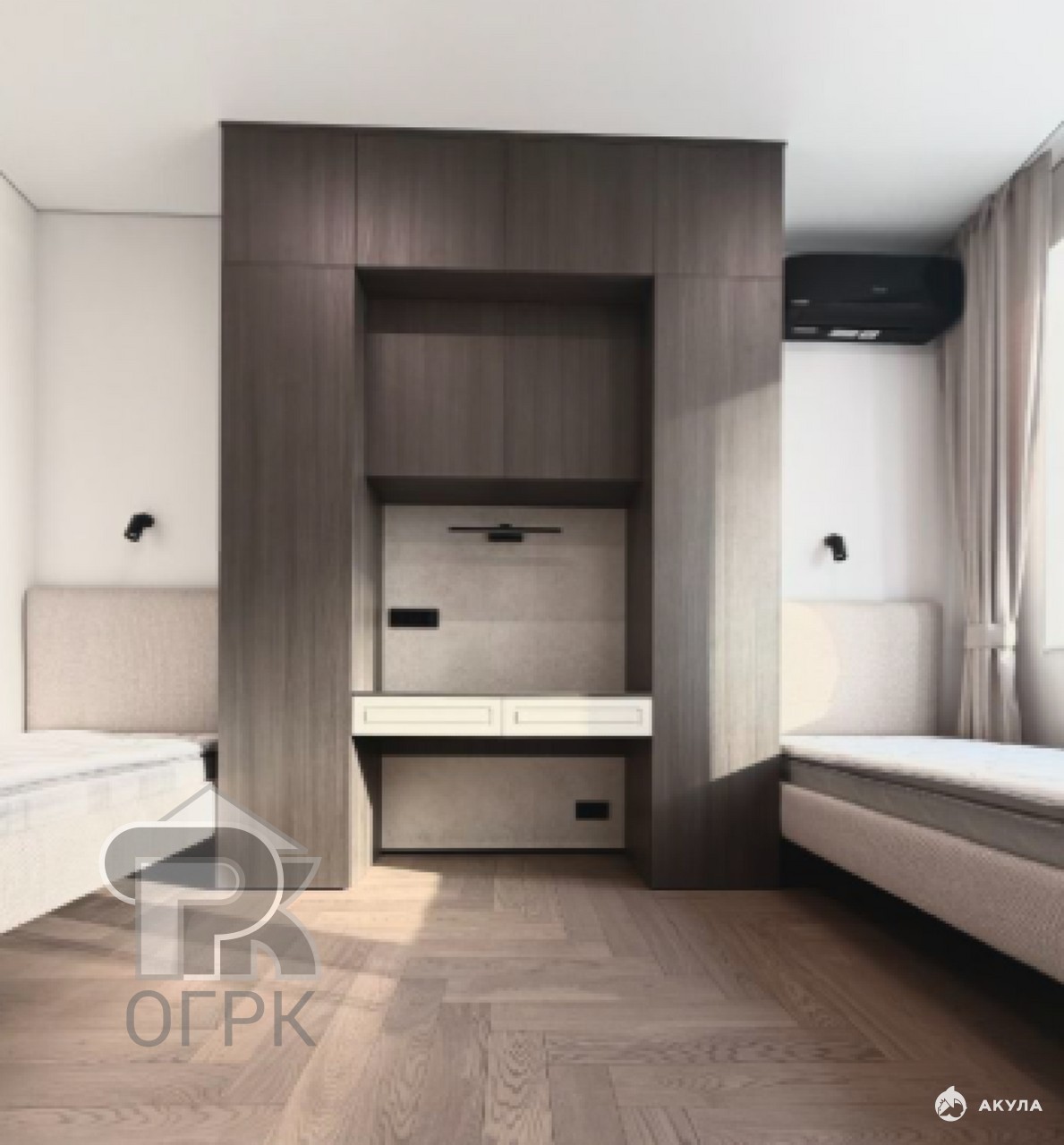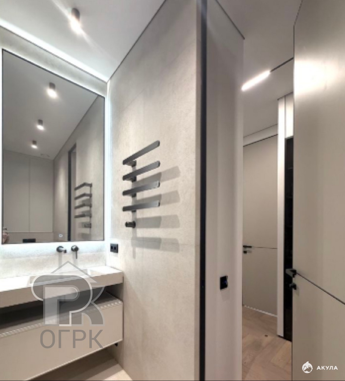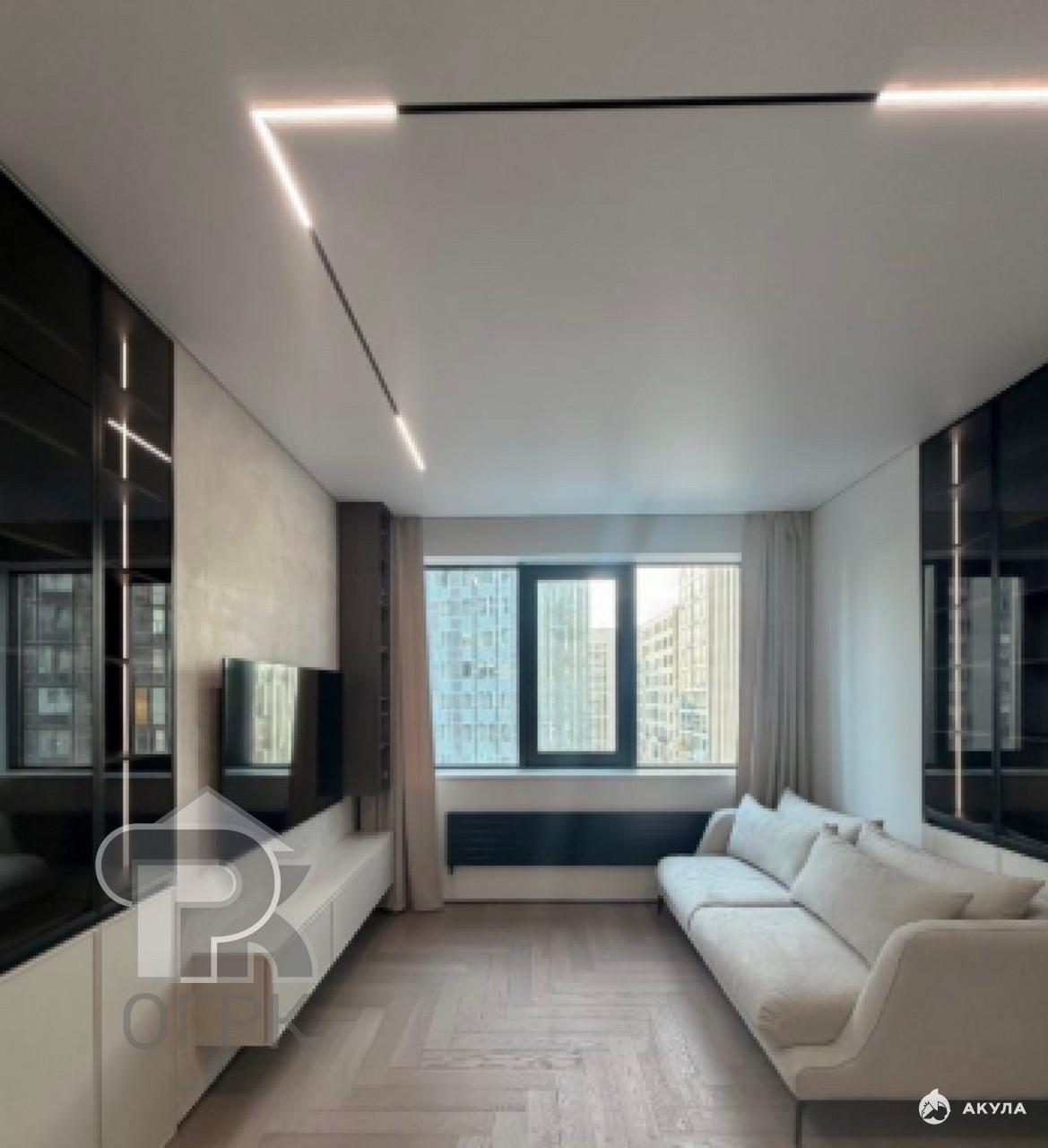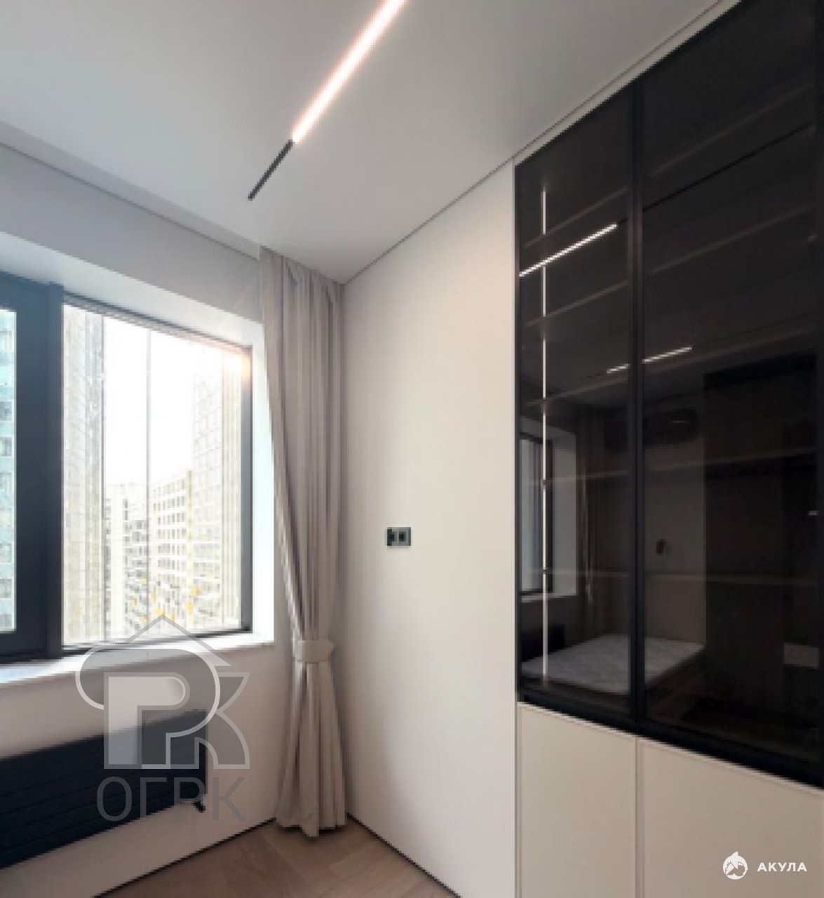 Интерьер поражает продуманностью и технологичностью: инженерная доска прайм селекции на полу, парящие потолки с теневой системой, скрытые двери высотой 2, 8 метра и интегрированная магнитная система освещения. Кухня-гостиная с островом и столешницей из камня оснащена техникой Liebherr и Bosch. В обеих ванных комнатах установлена премиальная сантехника Grohe, Villeroy & Boch и теплые полы. Особого внимания заслуживает организация пространства: 16 встроенных шкафов с фурнитурой Blum, гардеробная и парящие кровати со скрытой подсветкой создают невероятный объем и порядок.