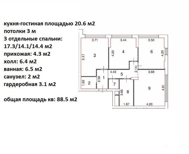- 3 отдельные спальни: 17.3/14.1/14.4 м2