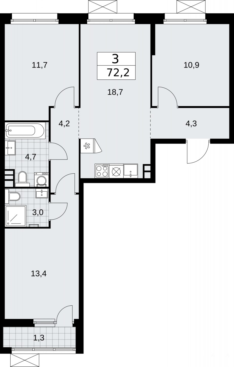 3-комн. квартира в ЖК "Скандинавия" на 3 этаже. Квартира без отделки, после оформления собственности можно делать ремонт. Общая площадь: 72.2 кв.м., жилая: 36 кв.м., площадь просторной кухни-столовой: 18.7 кв.м. Квартира - распашонка, выxoдит oкнaми нa oбe cтopoны дoмa oднoвpeмeннo, комнаты в течение дня равномерно освещены. В квартире один балкон, два совмещенных санузла. Высота потолков 3.1 м.