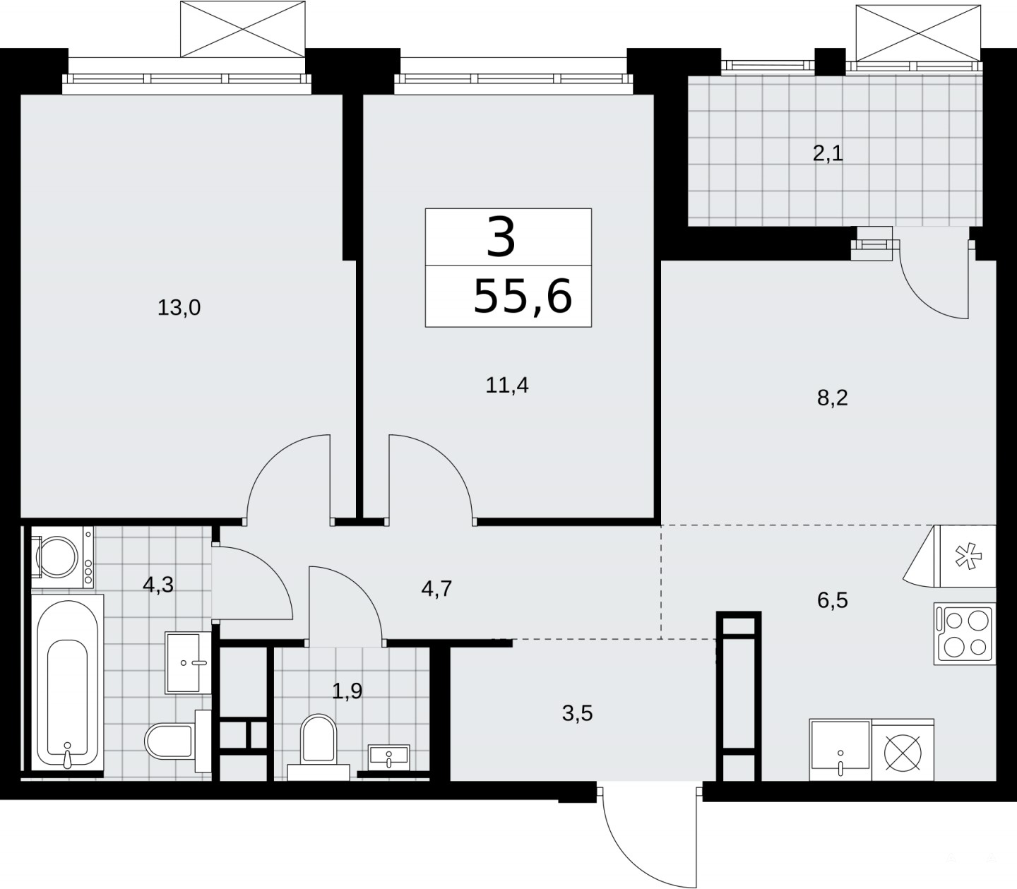 3-комн. квартира с европланировкой в ЖК "Скандинавия" на 17 этаже. Квартира без отделки, полностью готова к чистовой отделке и дальнейшему ремонту. Общая площадь: 55.6 кв.м., жилая: 32.6 кв.м., суммарная площадь гостиной-столовой с кухонной зоной: 14.7 кв.м. Европейская планировка, зона гостиной комнаты объединена с кухней. Комнаты изолированные, все окна выходят на одну сторону. В квартире одна лоджия, один совмещенный и один раздельный санузел. Высота потолков 3.1 м.