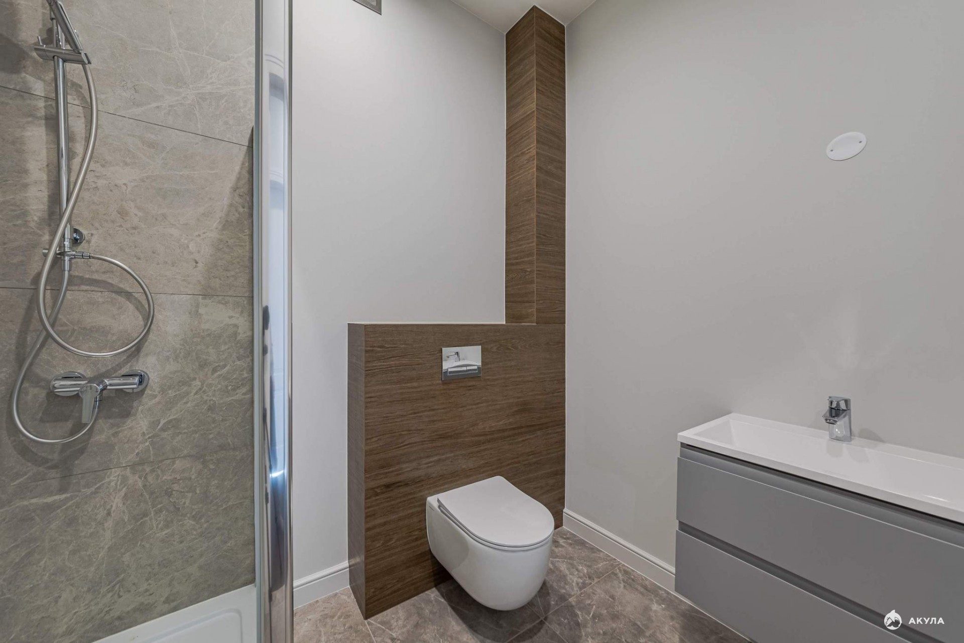 В санузле установлена вся сантехника, тумбочка под раковину, оборудован теплый пол.