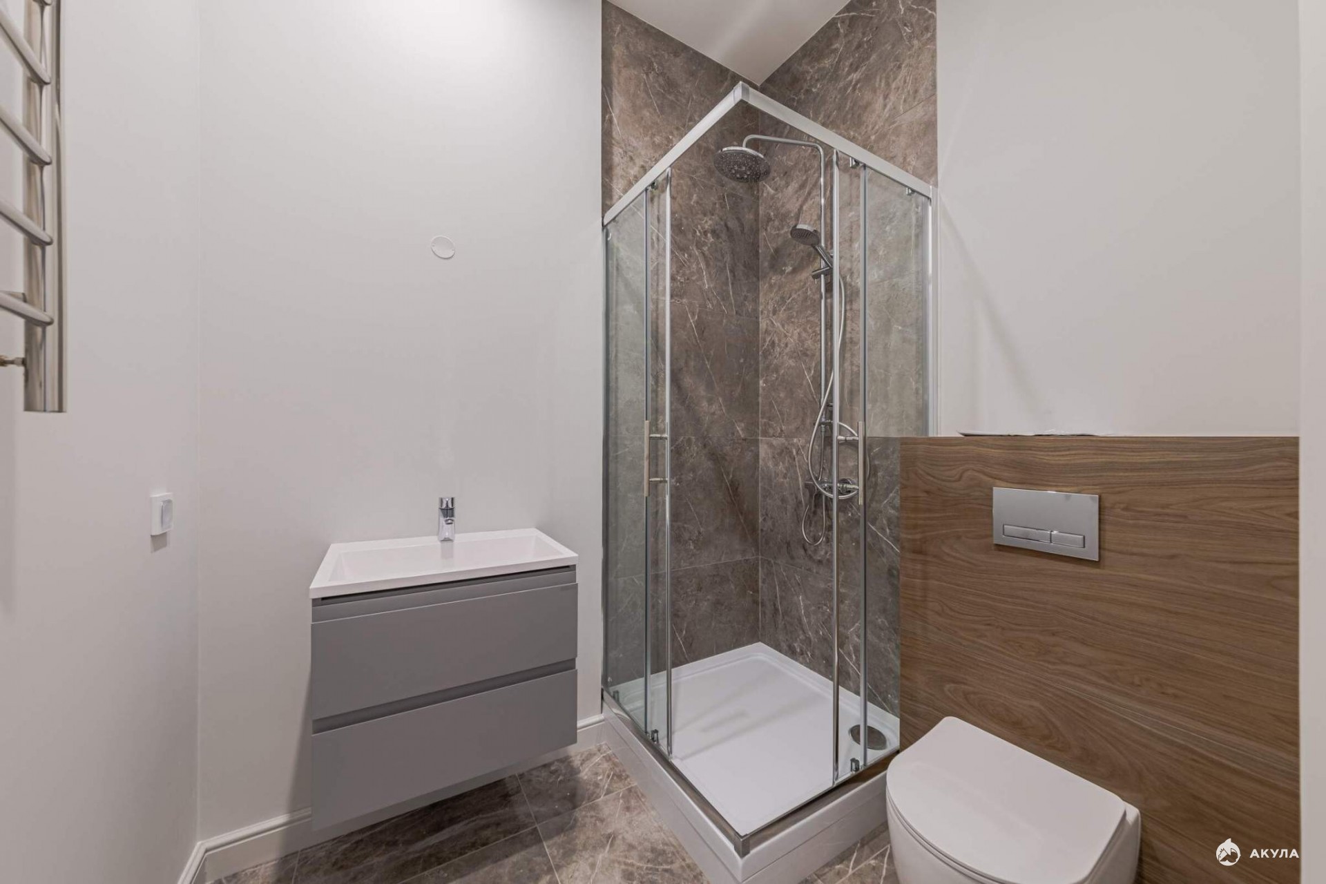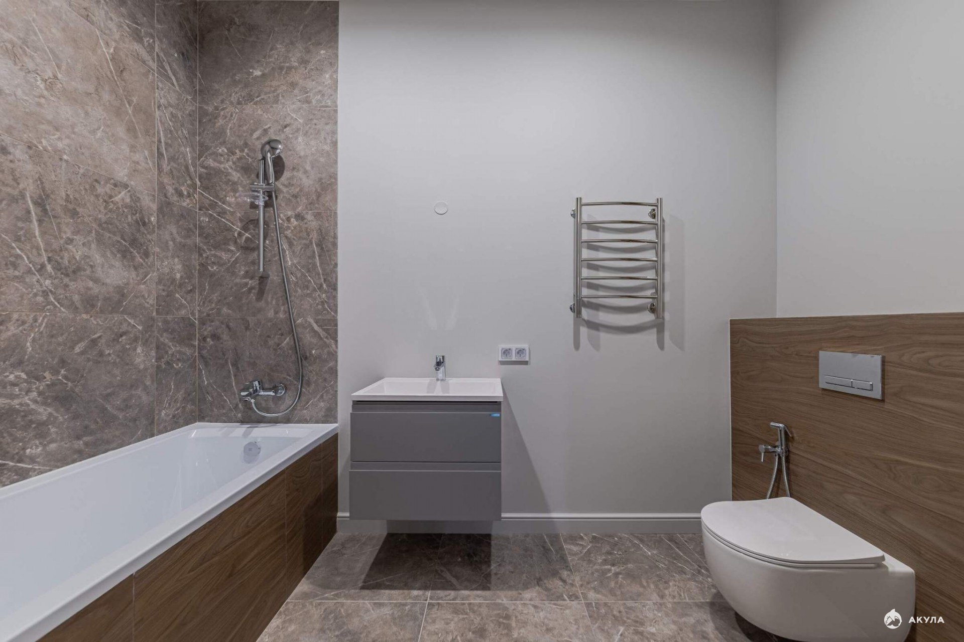 В санузле установлена вся сантехника, тумбочка под раковину, оборудован теплый пол.