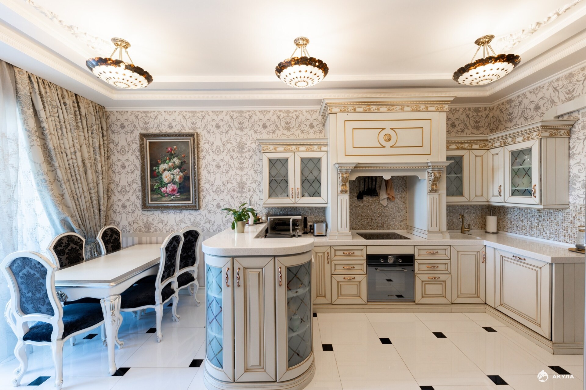 - невероятно светлая, просторная кухня-столовая в теплых оттенках с выходом на лоджию, и с прямым доступом к гостиной комнате, что Вы по-настоящему оцените, когда будете принимать своих гостей или собираться семьей за вечерними беседами у камина