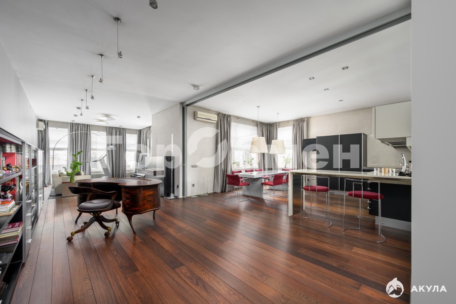 Высококачественный ремонт. Вся мебель из Италии от Ceccoti и Minotti, системы хранения Porro, фортепиано Sauter, знаменитый торшер Arco братьев Кастильони от Flos.