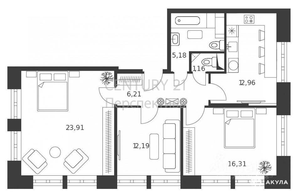 -3 изолированные комнаты ( 16, 3; 12, 1; 23, 9 кв. метров)