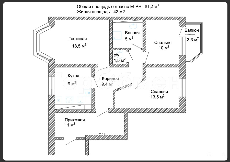- Три жилые комнаты общей площадью 42 м²— можно организовать отдельную спальню, детскую и кабинет или большую гостиную для всей семьи.