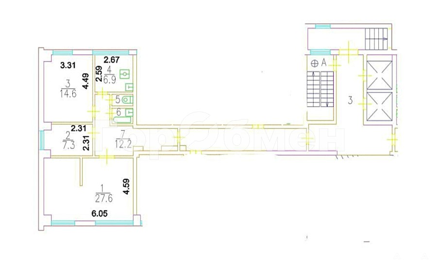 Санузел-раздельный, ванна, стены-плитка, гребенка+водосчетчики!.