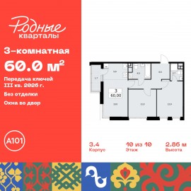 Просторная 3-комн. квартира с европланировкой в ЖК "Родные кварталы" на 10 этаже. Квартира без отделки, новый собственник может сделать ремонт по своему дизайн-проекту. Общая площадь: 60 кв.м., жилая: 36.9 кв.м., суммарная площадь гостиной-столовой с кухонной зоной: 18.6 кв.м....