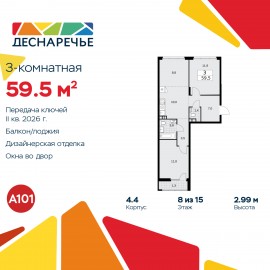 Трехкомнатная квартира с европланировкой и предчистовой отделкой в ЖК "Деснаречье" на 8 этаже. Общая площадь: 59.5 кв.м., жилая: 32.5 кв.м., суммарная площадь гостиной-столовой с кухонной зоной: 18.8 кв.м. Европейская планировка, площадь комнат позволяет разместить в них все...