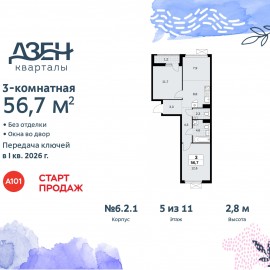 3-комн. квартира с европланировкой в ЖК "Дзен-кварталы" на 5 этаже. Квартира без отделки, новый собственник может сделать ремонт по своему проекту. Общая площадь: 56.7 кв.м., жилая: 32.2 кв.м., общая площадь гостиной-столовой с кухонной зоной: 16.7 кв.м. Европланировка, кухня и гостиная...