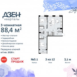Продается 3-комн. квартира бизнес-класса с европланировкой от застройщика в ЖК "Дзен-кварталы" на 7 этаже. Квартира без отделки, полностью готова к ремонту. Общая площадь: 88.3 кв.м., жилая: 42.9 кв.м., общая площадь гостиной-столовой с кухонной зоной: 37 кв.м. Европейская планировка,...