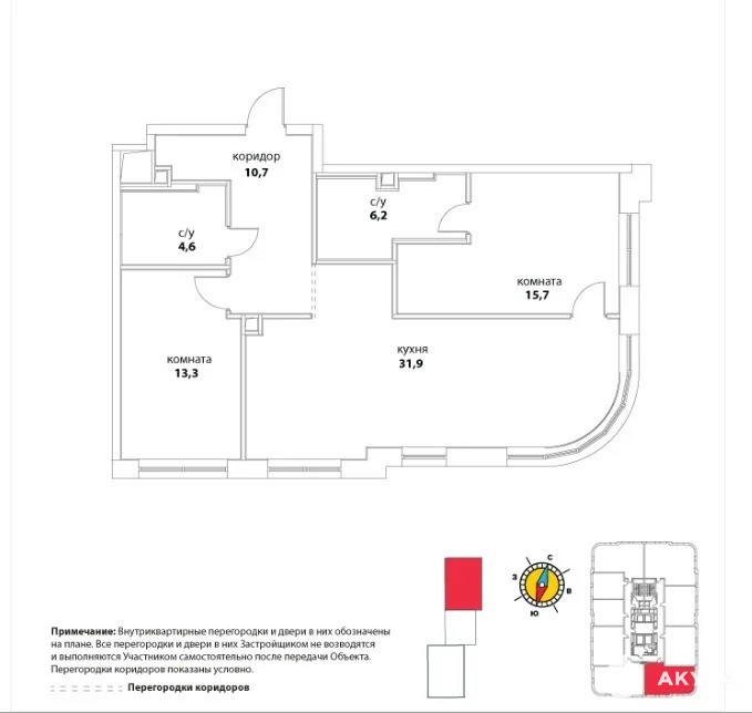 - планировка: 2 спальни, кухня-гостиная, можно сделать кабинет, 2 совмещенных санузла;
