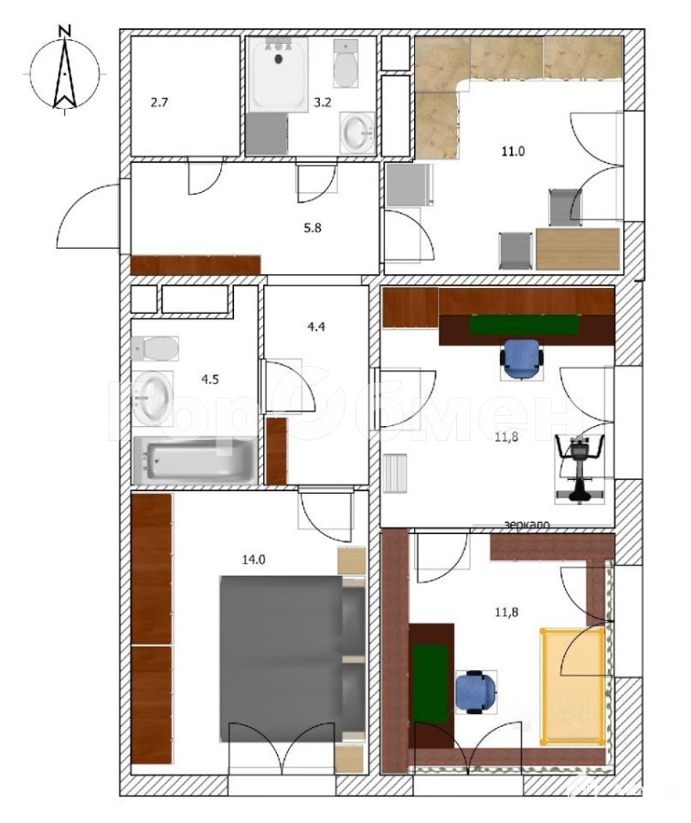 22этаж, комнаты 12, 12, 14 кв.м., кухня 11 кв.м., два полноценных санузла в одном душевая кабина, в другом ванна.