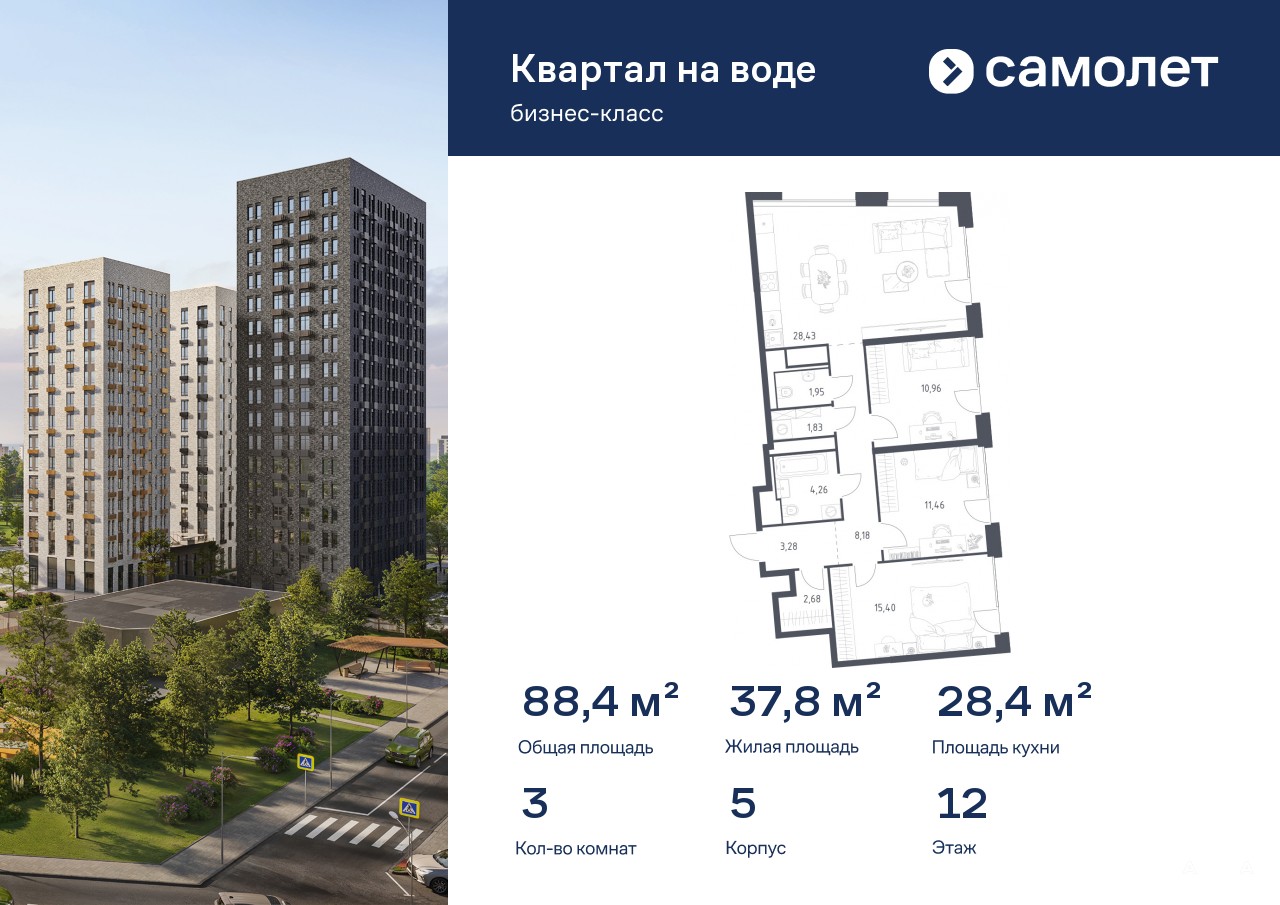 Строим кварталы для жизни с заботой о будущем. Предлагается 3-комнатная квартира бизнес-класса 88, 43 кв.м в корпусе 5 на 12 этаже, в ЖК «Квартал на воде»