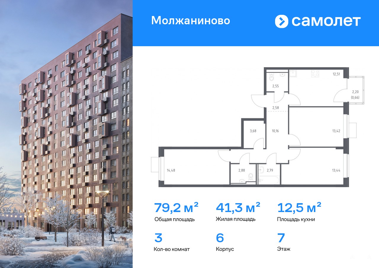 Строим кварталы для жизни с заботой о будущем. Предлагается 3-комнатная квартира комфорт-класса 79, 15 кв.м в корпусе 6 на 7 этаже, в ЖК «Молжаниново»