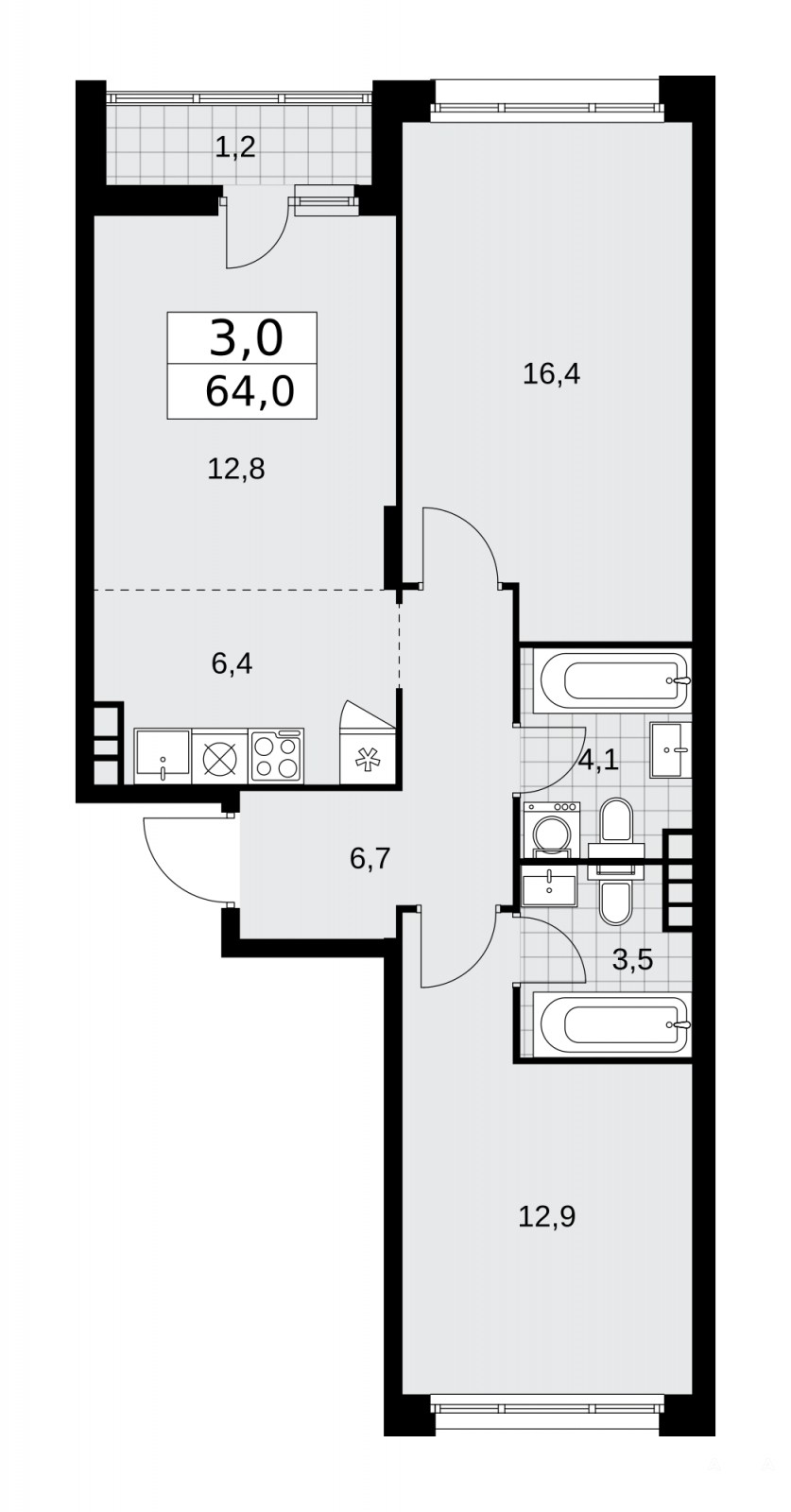 Трехкомнатная квартира с европланировкой в ЖК "Прокшино" на 8 этаже. Квартира без отделки, полностью готова к чистовой отделке и дальнейшему ремонту. Общая площадь: 64 кв.м., жилая: 42.1 кв.м., суммарная площадь гостиной-столовой с кухонной зоной: 19.2 кв.м. Европланировка, кухня и гостиная объединены в одно просторное помещение. Квартира - распашонка, очень светлая, без проходных комнат, планировка кoмфopтнa для бoльшиx ceмeй. В квартире одна лоджия, два совмещенных санузла. Высота потолков 2.99 м.