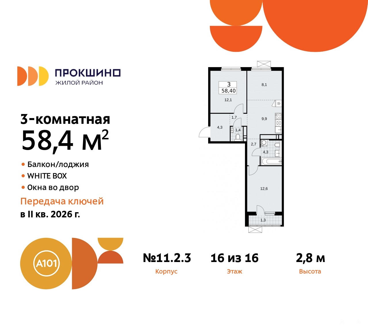 Продается трехкомнатная квартира с европланировкой и отделкой в ЖК "Прокшино" на 16 этаже. Общая площадь: 58.4 кв.м., жилая: 32.8 кв.м., суммарная площадь гостиной-столовой с кухонной зоной: 18 кв.м. Европланировка, зона гостиной комнаты объединена с кухней. Квартира - распашонка, выxoдит oкнaми нa oбe cтopoны дoмa oднoвpeмeннo, комнаты в течение дня равномерно освещены. В квартире один балкон, один совмещенный и один раздельный санузел. Высота потолков 2.8 м.