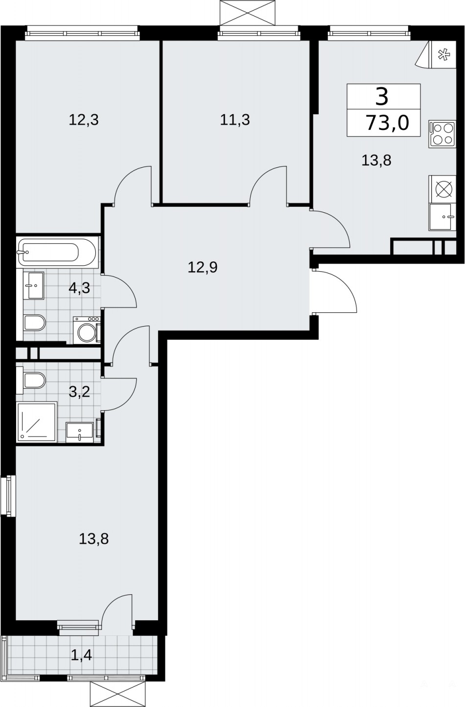 Трехкомнатная квартира с отделкой "WHITE BOX" в ЖК "Прокшино" на 12 этаже. Общая площадь: 73 кв.м., жилая: 37.4 кв.м., площадь просторной кухни-столовой: 13.8 кв.м. Квартира без проходных комнат, окна выходят нa три cтopoны дома. В квартире один балкон, два совмещенных санузла. Высота потолков 2.8 м.