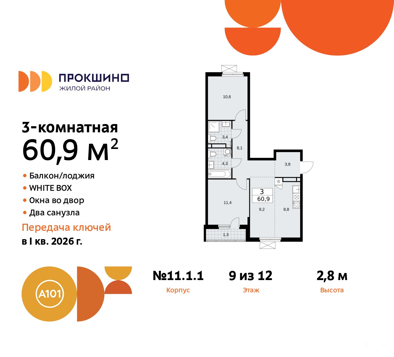 Продается 3-комн. квартира с предчистовой отделкой в ЖК "Прокшино" на 9 этаже. Общая площадь: 60.8 кв.м. Высота потолков 2.8 м.