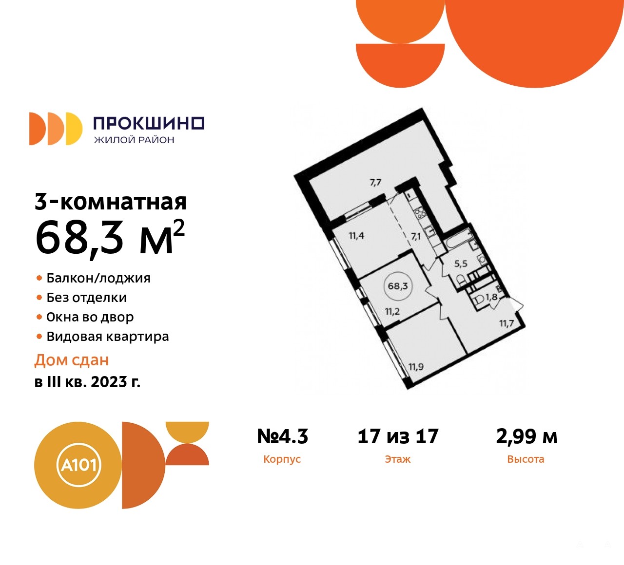 3-комн. квартира в ЖК "Прокшино" на 17 этаже. Квартира без отделки, после выдачи ключей можно делать ремонт. Общая площадь: 68.3 кв.м., жилая: 34.5 кв.м., площадь кухни: 7.1 кв.м. Угловая квартира, окна oбecпeчивaют paвнoмepнoe ocвeщeниe в тeчeниe дня. В квартире один балкон, один совмещенный и один раздельный санузел. Терраса размером 7.7 кв.м. представляет собой роскошную зону отдыха, где вы на свой вкус можете создать атмосферу комфорта и уюта. Высота потолков 2.99 м.