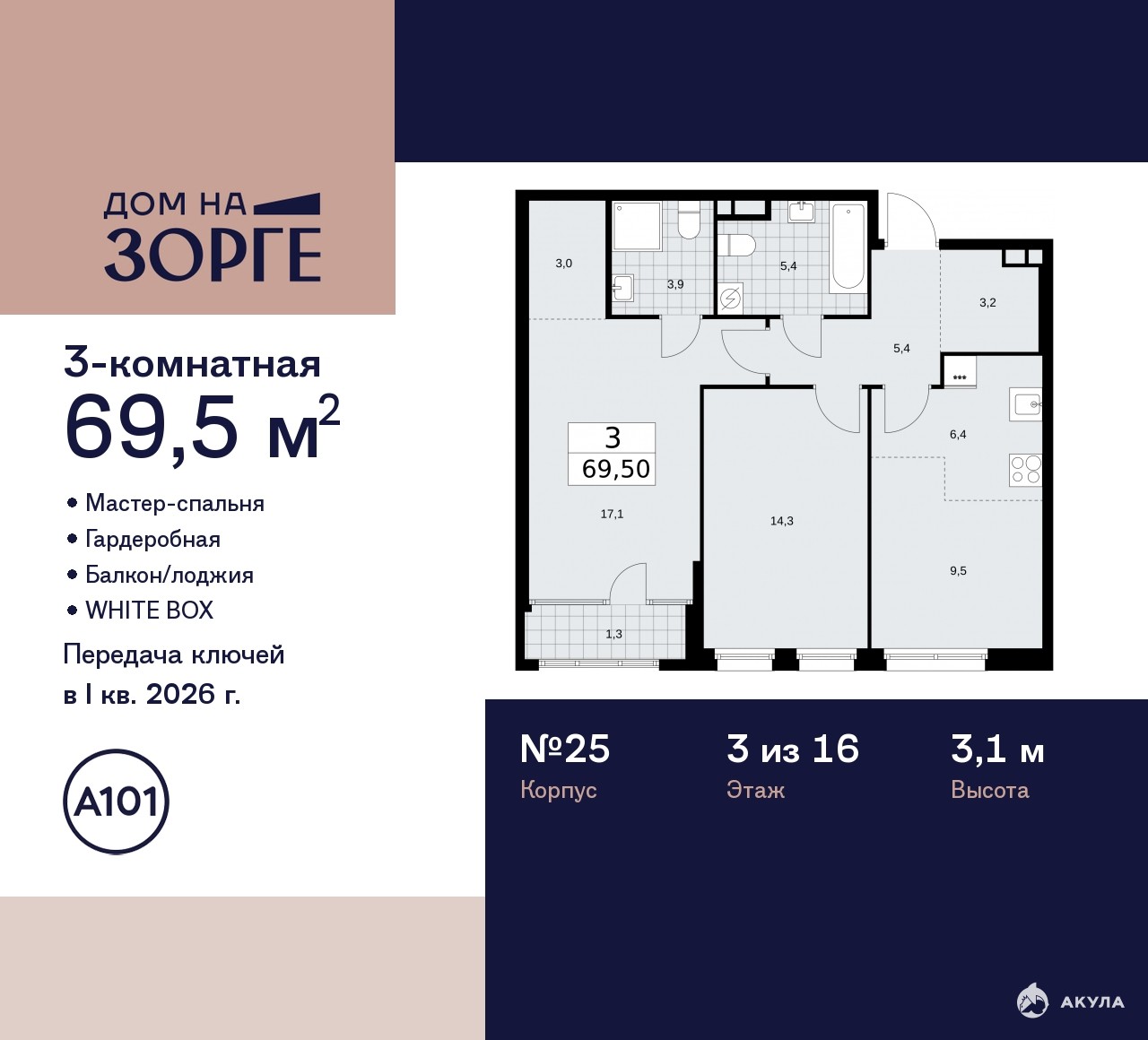 Продается трехкомнатная квартира с европланировкой и предчистовой отделкой в ЖК "Дом на Зорге" на 3 этаже. Общая площадь: 69.5 кв.м., жилая: 43.9 кв.м., суммарная площадь гостиной-столовой с кухонной зоной: 14.9 кв.м. Европейская планировка, кухня-гостиная - идеальный вариант для тех, кто любит часто принимать гостей. Комнаты изолированные, все окна выходят на одну сторону. В квартире одна лоджия, два совмещенных санузла. Высота потолков 3.1 м.