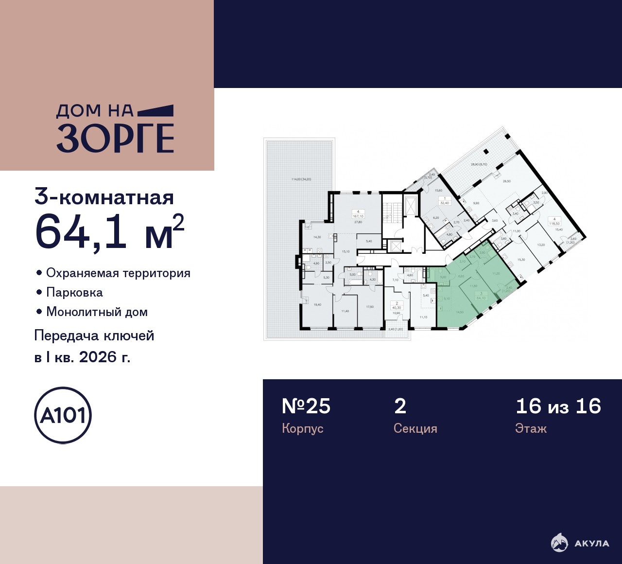 Продается трехкомнатная квартира с европланировкой и первичной отделкой в ЖК "Дом на Зорге" на 16 этаже. Общая площадь: 64.1 кв.м., жилая: 37.5 кв.м., общая площадь гостиной-столовой с кухонной зоной: 19.6 кв.м. Европейская планировка, кухня и гостиная объединены в одно просторное помещение. Угловая квартира, окна oбecпeчивaют paвнoмepнoe ocвeщeниe в тeчeниe дня. В квартире одна лоджия, два совмещенных санузла. Высота потолков 3.1 м.