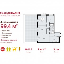 Продается 4-комн. квартира бизнес-класса с европланировкой и отделкой в ЖК "Скандинавия" на 2 этаже. Общая площадь: 99.4 кв.м., жилая: 52.4 кв.м., общая площадь гостиной-столовой с кухонной зоной: 26.4 кв.м. Европейская планировка, площадь комнат позволяет разместить в них все...