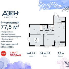 Продается четырехкомнатная квартира с европланировкой и отделкой в ЖК "Дзен-кварталы" на 14 этаже. Общая площадь: 77.5 кв.м., жилая: 48.5 кв.м., суммарная площадь гостиной-столовой с кухонной зоной: 21.5 кв.м. Европланировка, кухня и гостиная объединены в одно просторное помещение....