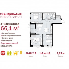 Просторная 4-комн. квартира с европланировкой и отделкой в ЖК "Скандинавия" на 16 этаже. Общая площадь: 66.1 кв.м., жилая: 43.3 кв.м., общая площадь гостиной-столовой с кухонной зоной: 16.7 кв.м. Европейская планировка, площадь комнат позволяет разместить в них все необходимое, а в...