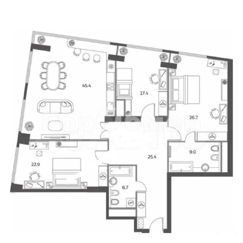 Планировка: просторный холл, кухня-гостинная, мастер-спальня, 2 изолированные спальни, санузел.