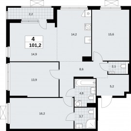4-комн. квартира с европланировкой в ЖК "Бунинские кварталы" на 16 этаже. Квартира без отделки, новый собственник может сделать ремонт по индивидуальному дизайн-проекту. Общая площадь: 101.2 кв.м., жилая: 60.6 кв.м., суммарная площадь гостиной-столовой с кухонной зоной: 29.1 кв.м....