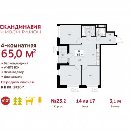 4-комн. квартира бизнес-класса с европланировкой и отделкой в ЖК "Скандинавия" на 14 этаже. Общая площадь: 65 кв.м., жилая: 43.2 кв.м., общая площадь гостиной-столовой с кухонной зоной: 16.6 кв.м. Европланировка, кухня-гостиная - идеальный вариант для тех, кто любит часто принимать...