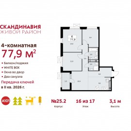 Просторная четырехкомнатная квартира бизнес-класса с европланировкой и предчистовой отделкой в ЖК "Скандинавия" на 16 этаже. Общая площадь: 77.9 кв.м., жилая: 47 кв.м., общая площадь гостиной-столовой с кухонной зоной: 20.5 кв.м. Европейская планировка, зона гостиной комнаты...