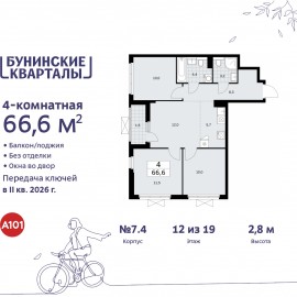 4-комн. квартира с европланировкой в ЖК "Бунинские кварталы" на 12 этаже. Квартира без отделки, после получения ключей можно делать ремонт. Общая площадь: 66.6 кв.м., жилая: 43.5 кв.м., суммарная площадь гостиной-столовой с кухонной зоной: 17.7 кв.м. Европейская планировка, за счет...
