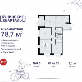 4-комн. квартира с европланировкой в ЖК "Бунинские кварталы" на 20 этаже. Квартира без отделки, после оформления собственности можно делать ремонт. Общая площадь: 65.6 кв.м., жилая: 43.1 кв.м., общая площадь гостиной-столовой с кухонной зоной: 16.6 кв.м. Европланировка, кухня и...