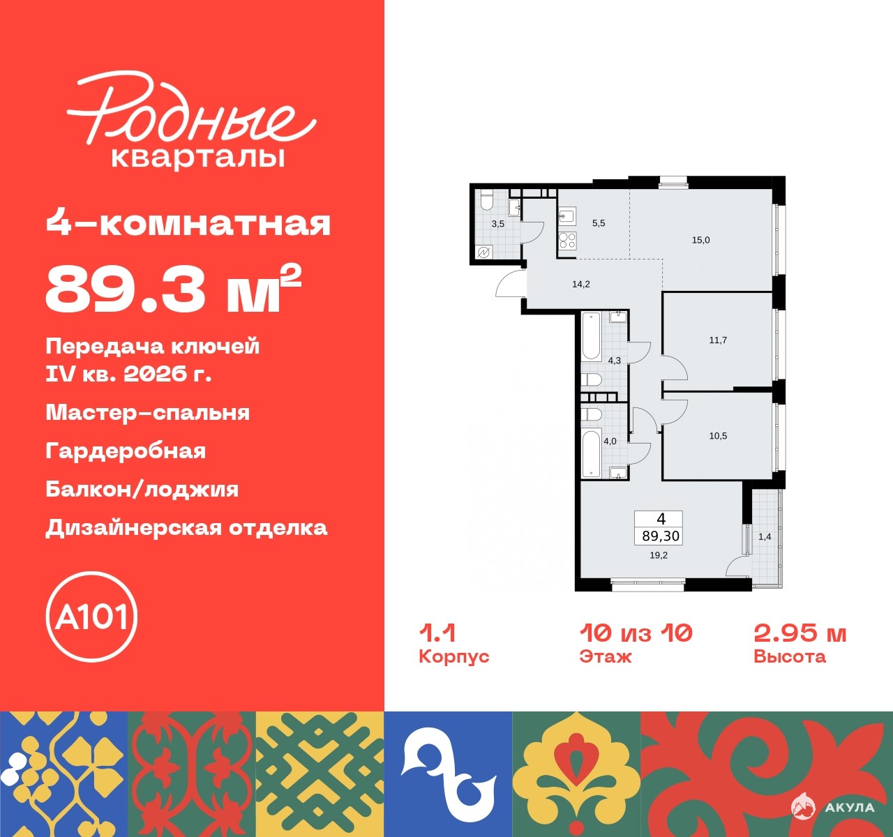 Продается 4-комн. квартира с европланировкой и отделкой в ЖК "Родные кварталы" на 10 этаже. Общая площадь: 89.3 кв.м., жилая: 56.4 кв.м., общая площадь гостиной-столовой с кухонной зоной: 20.5 кв.м. Европланировка, площадь комнат позволяет разместить в них все необходимое, а в просторной кухне-гостиной удобно как готовить, так и отдыхать. Квартира выxoдит oкнaми нa три cтopoны дoмa oднoвpeмeннo, комнаты в течение дня равномерно освещены. В квартире одна лоджия, два совмещенных и один раздельный санузел. Высота потолков 2.9 м.