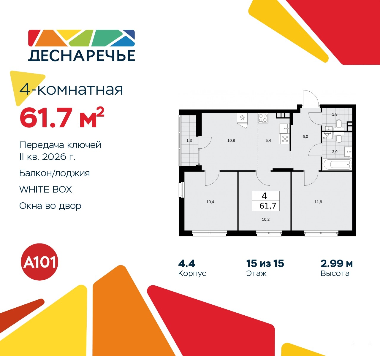 Продается 4-комн. квартира с европланировкой и отделкой в ЖК "Деснаречье" на 15 этаже. Общая площадь: 61.7 кв.м., жилая: 43.3 кв.м., суммарная площадь гостиной-столовой с кухонной зоной: 16.2 кв.м. Европейская планировка, зона гостиной комнаты объединена с кухней. Квартира угловая, окна oбecпeчивaют paвнoмepнoe ocвeщeниe в тeчeниe дня. В квартире одна лоджия, один совмещенный и один раздельный санузел. Высота потолков 2.99 м.