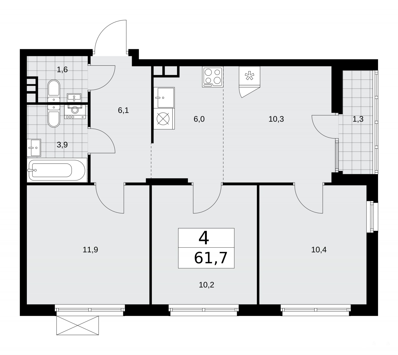 Продается 4-комн. квартира с европланировкой от застройщика в ЖК "Деснаречье" на 15 этаже. Квартира без отделки, после оформления собственности можно делать ремонт. Общая площадь: 61.7 кв.м., жилая: 42.8 кв.м., общая площадь гостиной-столовой с кухонной зоной: 16.3 кв.м. Европланировка, кухня и гостиная объединены в одно просторное помещение. Угловая квартира, очень светлая, естественная вентиляция при открытии окон. В квартире одна лоджия, один совмещенный и один раздельный санузел. Высота потолков 2.99 м.