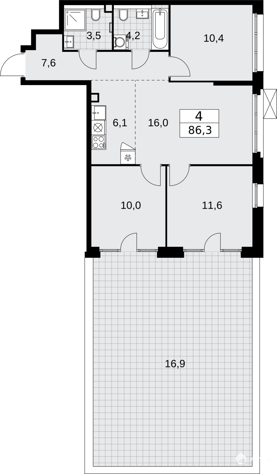 4-комн. квартира с отделкой в ЖК "Деснаречье" на 2 этаже. Общая площадь: 85.8 кв.м. Наличие террасы в квартире дает возможность для обустройства дополнительной площади. Высота потолков 2.95 м.