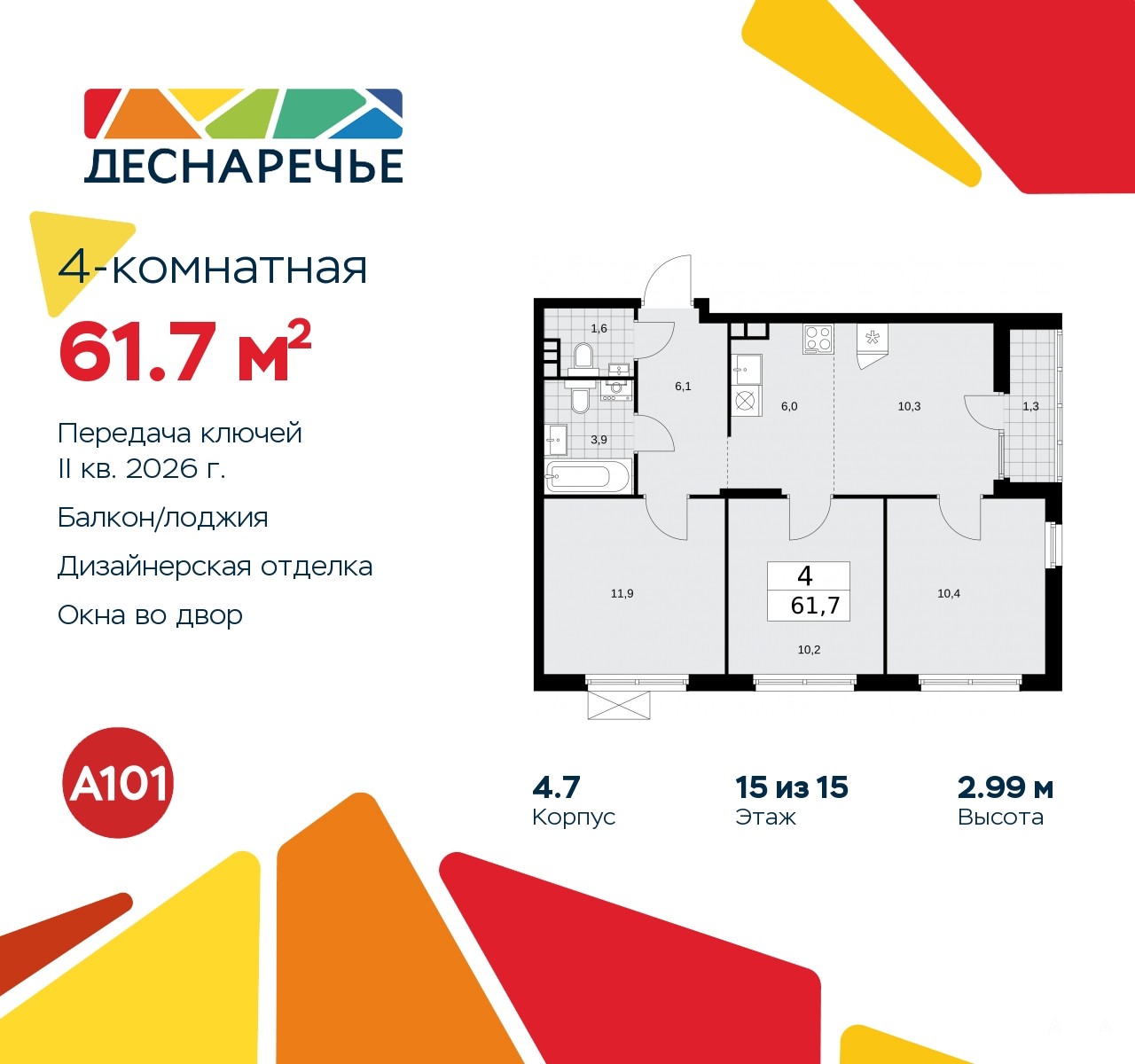 Продается 4-комн. квартира с европланировкой и отделкой в ЖК "Деснаречье" на 15 этаже. Общая площадь: 61.7 кв.м., жилая: 42.8 кв.м., суммарная площадь гостиной-столовой с кухонной зоной: 16.3 кв.м. Европейская планировка, за счет большой площади кухни-гостиной квартира выглядит просторной и очень удобна для жизни. Угловая квартира, очень светлая, естественная вентиляция при открытии окон. В квартире одна лоджия, один совмещенный и один раздельный санузел. Высота потолков 2.99 м.
