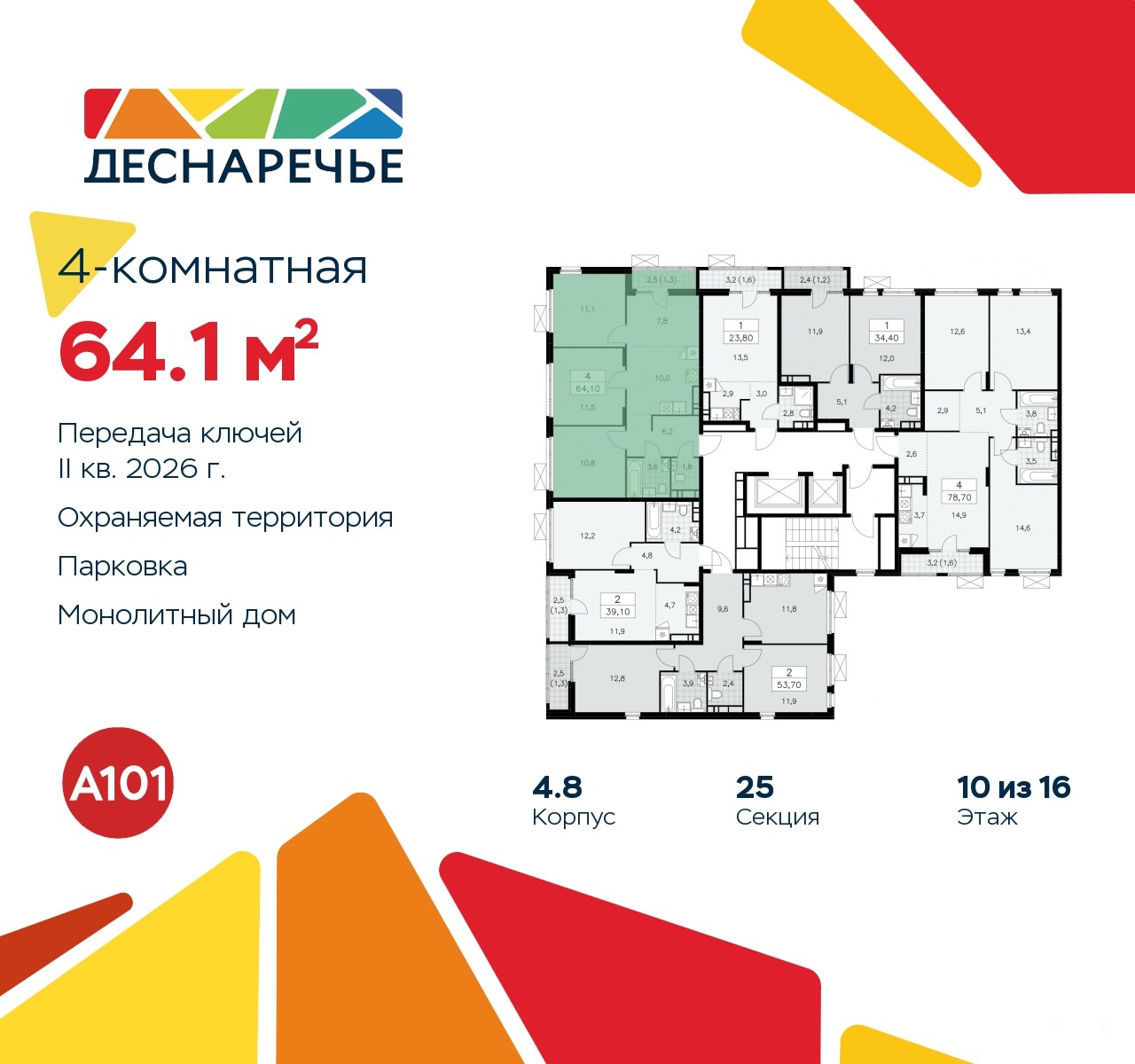 Дом монолитный, многоподъездный, переменной этажности, от 7 до 16 этажей. Квартира находится в 4-й секции высотой 12 этажей в корпусе 4.8. На этаже 6 квартир. В подъезде 1 пассажирский и 1 грузовой лифт. Начало строительства - 3 квартал 2023 года. Окончание строительства - 2 квартал 2026 года. Оформление сделки по договору долевого участия.