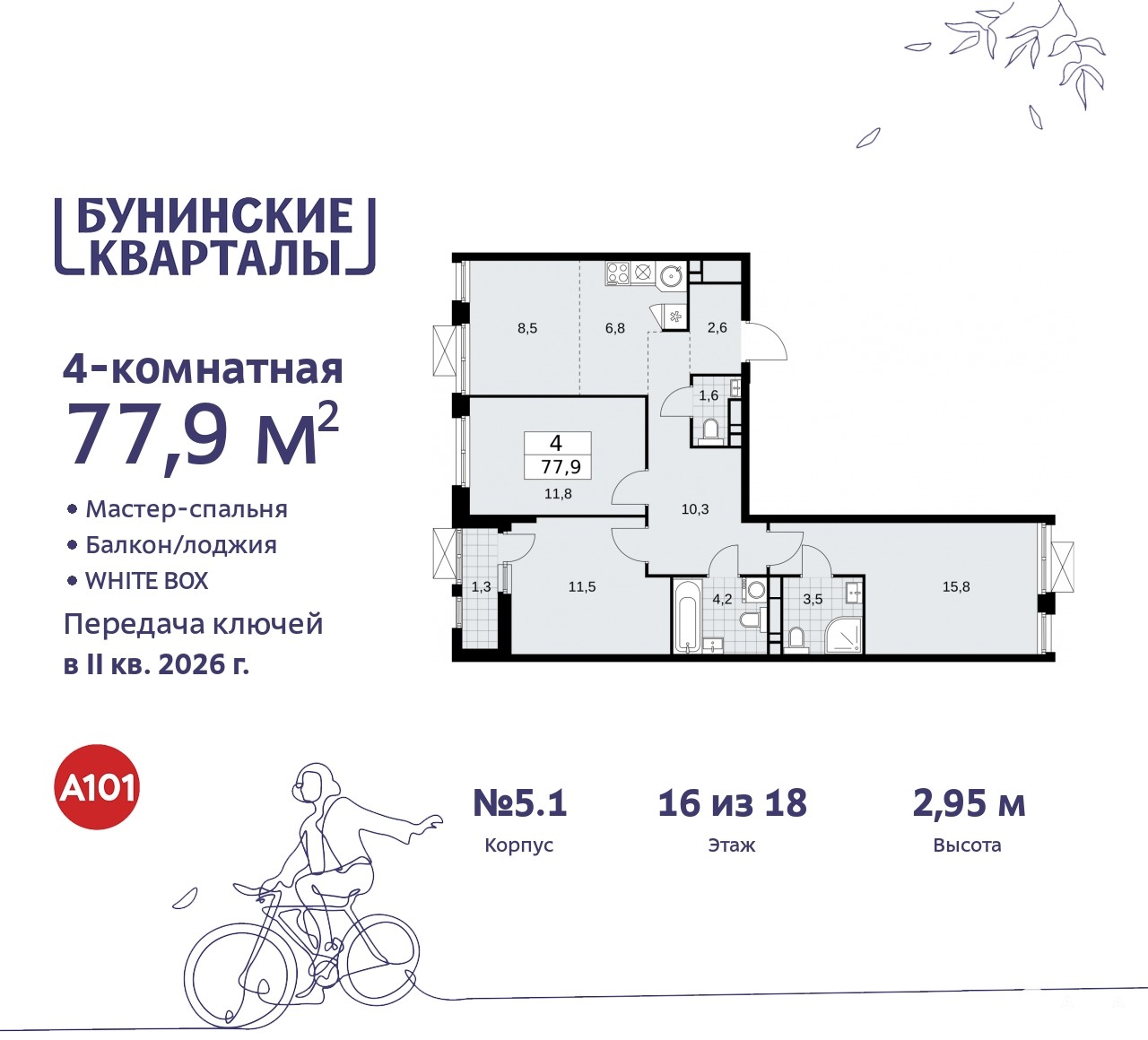 Продается 4-комн. квартира с европланировкой и отделкой в ЖК "Бунинские кварталы" на 16 этаже. Общая площадь: 77.9 кв.м., жилая: 47.6 кв.м., общая площадь гостиной-столовой с кухонной зоной: 15.3 кв.м. Европейская планировка, зона гостиной комнаты объединена с кухней. Квартира - распашонка, без проходных комнат, окна выходят на paзные стороны дома. В квартире одна лоджия, два совмещенных и один раздельный санузел. Высота потолков 2.95 м.
