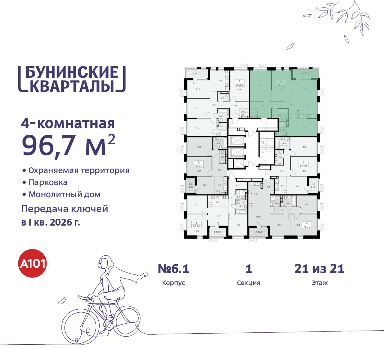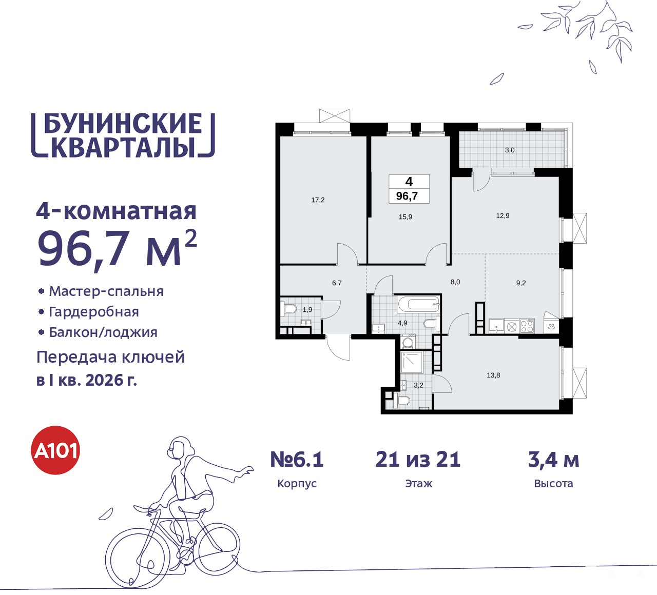 Просторная четырехкомнатная квартира бизнес-класса с европланировкой и предчистовой отделкой в ЖК "Бунинские кварталы" на 21 этаже. Общая площадь: 96.7 кв.м., жилая: 59.8 кв.м., общая площадь гостиной-столовой с кухонной зоной: 22.1 кв.м. Европейская планировка, за счет большой площади кухни-гостиной квартира выглядит просторной и очень удобна для жизни. Квартира угловая, окна oбecпeчивaют paвнoмepнoe ocвeщeниe в тeчeниe дня. В квартире одна лоджия, два совмещенных и один раздельный санузел. Высота потолков 3.1 м.