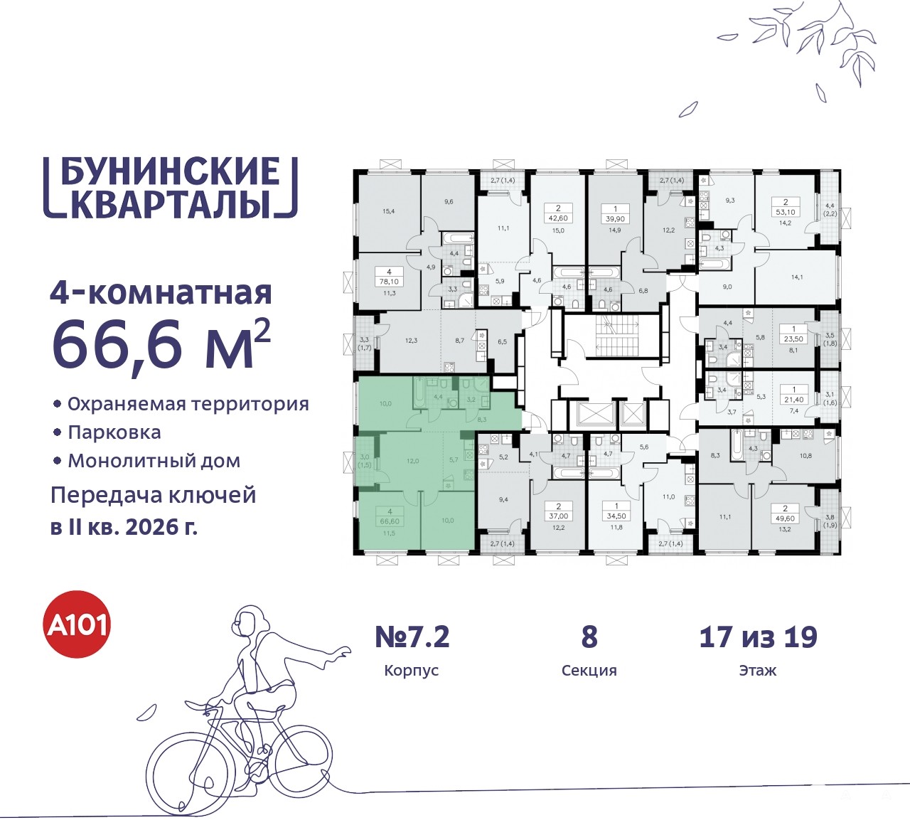 4-комн. квартира с отделкой в ЖК "Бунинские кварталы" на 17 этаже. Общая площадь: 66.4 кв.м. Высота потолков 2.8 м.