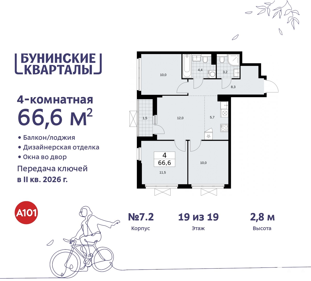 Продается четырехкомнатная квартира с отделкой в ЖК "Бунинские кварталы" на 19 этаже. Общая площадь: 66.4 кв.м. Высота потолков 2.8 м.